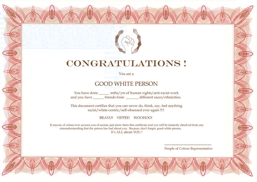 certificate with fancy border. at top centre is a drawn logo of a white fist surrounded by a wreath of smaller various coloured hands. underneath reads "CONGRATULATIONS! You are a GOOD WHITE PERSON. You have done ___ months / years of human rights / anti-racist work and you have ___ friends from ___ different races / ethnicities. This document certifies that you can never do, think, say, feel anything racist / white-centric / self-obsessed ever again !!!! BRAVO! YIPPEE! WOOHOO! If anyone of colour ever accuses you of racism, just show them this certificate and you will be instantly absolved from any misunderstanding the person has said about you. Because, don't forget, good white person, It's ALL about YOU!" Below in bottom right corner is a line for a signature, under which reads "People of Colour Representative"